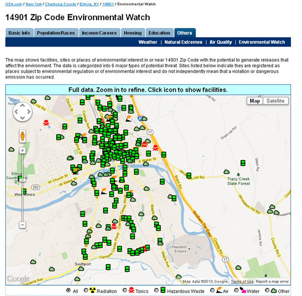 Zip Code with the potential to generate releases that affect the environment from http://www.usa.com/14901-ny-environmental-watch.htm.
